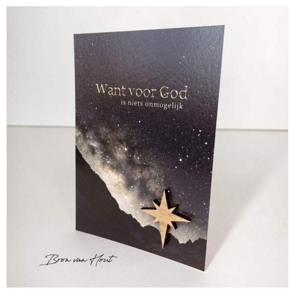 Deze kleine kaartenstandaard bestaat uit een ster van eiken/mdf en een eikenblokje met een magneetje. Hiertussen kan je een kaart plaatsen waardoor deze blijft staan. Geschikt tot en met kaart formaat A6.