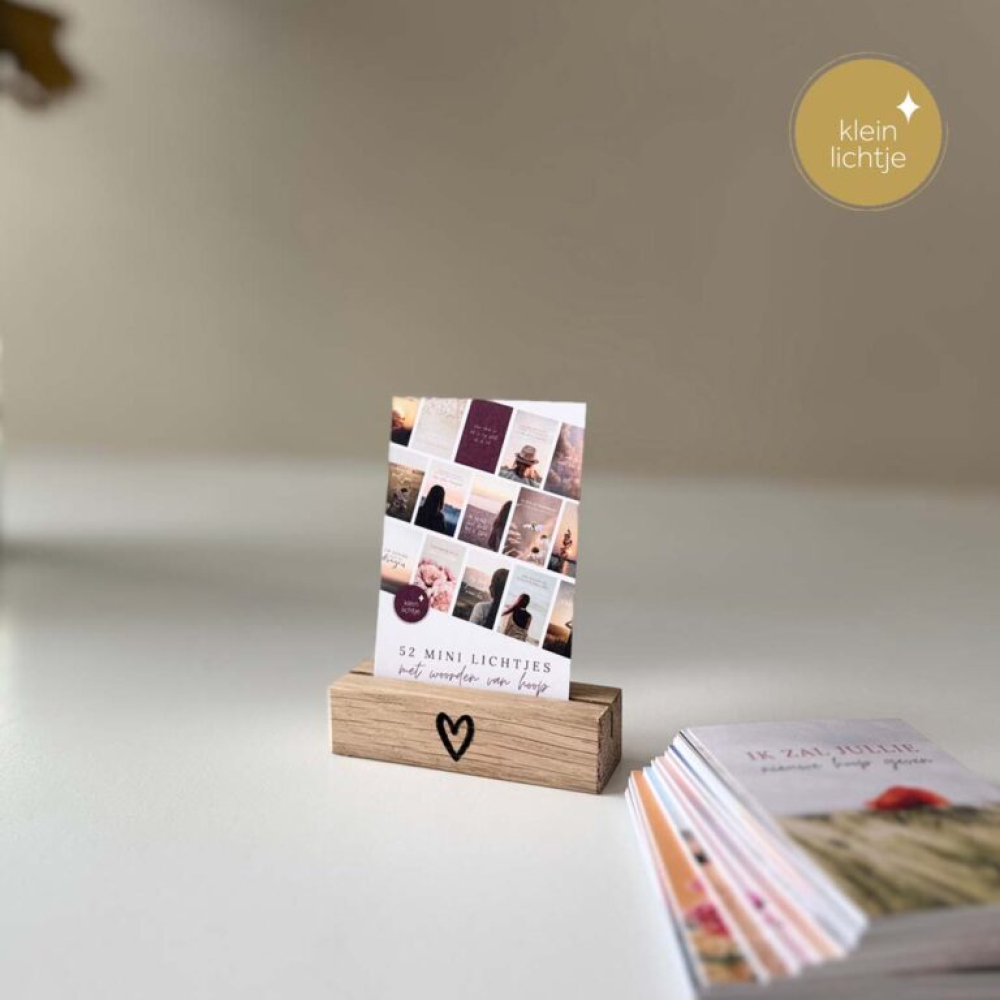 Deze set bestaat uit 52 mini kaartjes met Lichtjes en een leuke kleine standaard, van Bron van Hout, met een hartje erop.