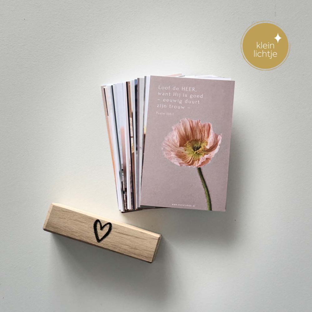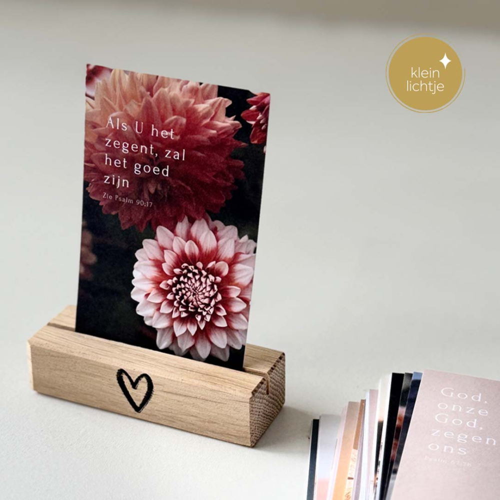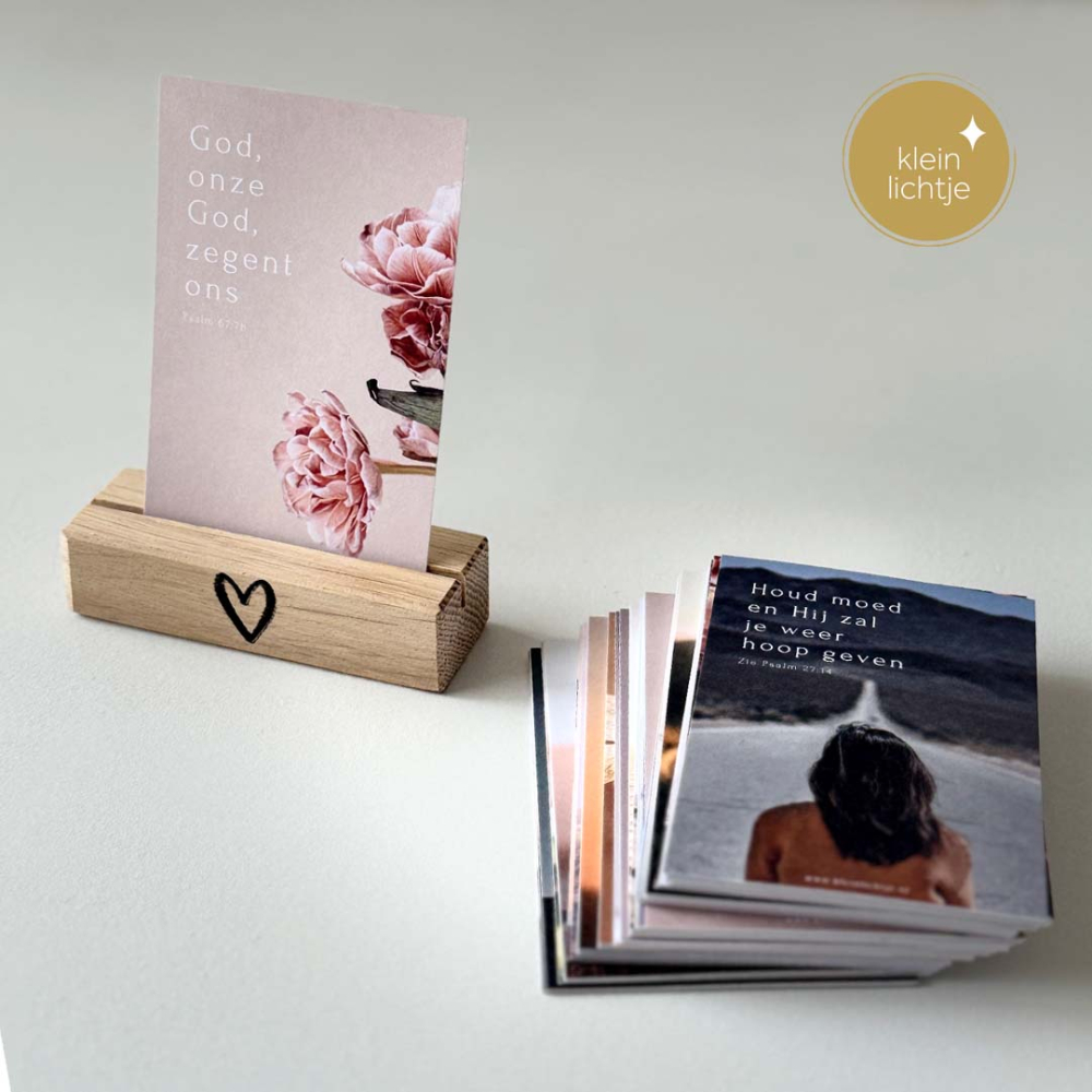 Deze set bestaat uit 52 mini kaartjes van Lichtjes met Psalmen en een leuke kleine standaard, van Bron van Hout, met een hartje erop.